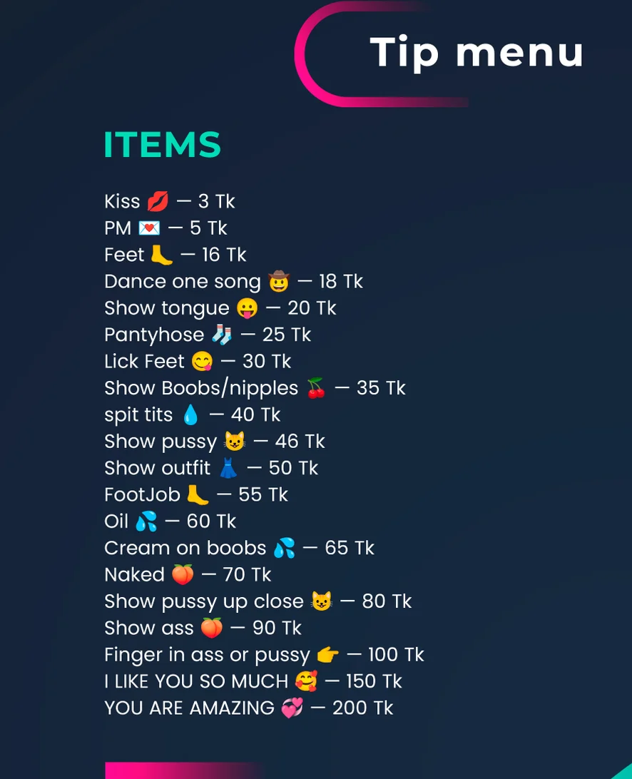 Інструкція з мастурбування, Мінет, Оргазм, Мастурбація рукою, Фут-джоб, Олійне шоу, Йога, Тверкінг, Задерта спідниця, Топлес, Поза вершниці, Ахеґао, Фут-фетиш, Приниження, Рольові ігри, Масаж, Мастурбація, Жорсткий секс, Догі-стайл, Еротичні танці, Спанкінг, Оцінювання прутня, Мастурбація пальцями, Брудні розмови, Стриптиз